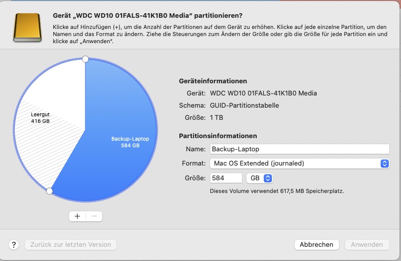 Achtung: aus der Festplatte wieder "eine" zu machen, wäre über die Funktion lösen beider Partionen möglich. Das geht, aber alle Daten auf der Platte sind dann gelöscht. Falls gewünscht, die Daten erst auf eine zweite Platte kopieren.